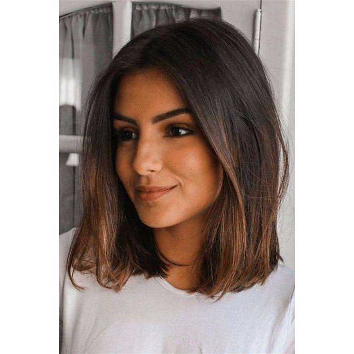 Short sleek look with darker roots and caramel balayage with a natural lace front hairline